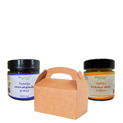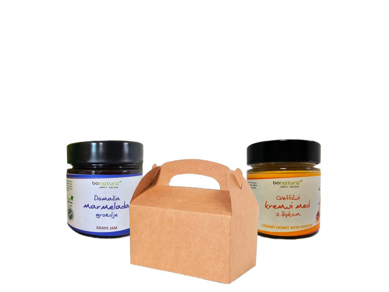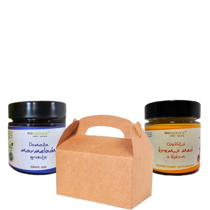 Darilni paket-medeno sadno združuje nežno toplino cvetličnega kremnega medu s šipkom in bogat sadni okus marmelade iz grozdja. Popolna kombinacija za sladke trenutke razvajanja, kjer se prepletata naravna moč in sadna harmonija.
