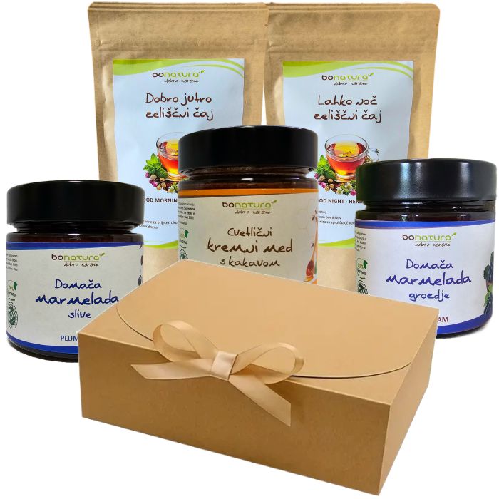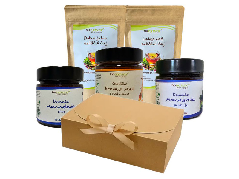 PAKIRANO: cvetlični kremni med z surovim kakavom neto količina 250 g, domača marmelada sliva neto količina 250 g, domača marmelada grozdje neto količine 250 g, zeliščni čaj - dober dan neto količina 30 g, zeliščni čaj - lahko noč neto količina 30 g.