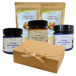 Darilni paket Harmonija okusa je ustvarjen za tople trenutke, prijetne pavze in male večerne ali jutranje rituale. Kremni med s surovim kakavom poskrbi za čokoladno razvado brez slabe vesti, marmelada iz sliv za bogato domačo aromo, marmelada iz grozdja za naravno sladek, poln okus, čaj Za lahko noč za nežno umiritev pred spanjem ter čaj Dober dan za prijeten, svež začetek dneva – vse, kar potrebujete za popolno dnevno ravnovesje.