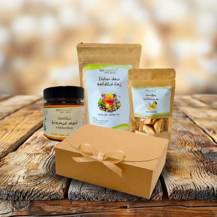 PAKIRANO: cvetlični kremni med z surovim kakavom neto količina 250 g, zeliščni čaj- lahko noč neto količina 30 g, hruška liofilizirano neto količina 25 g.
