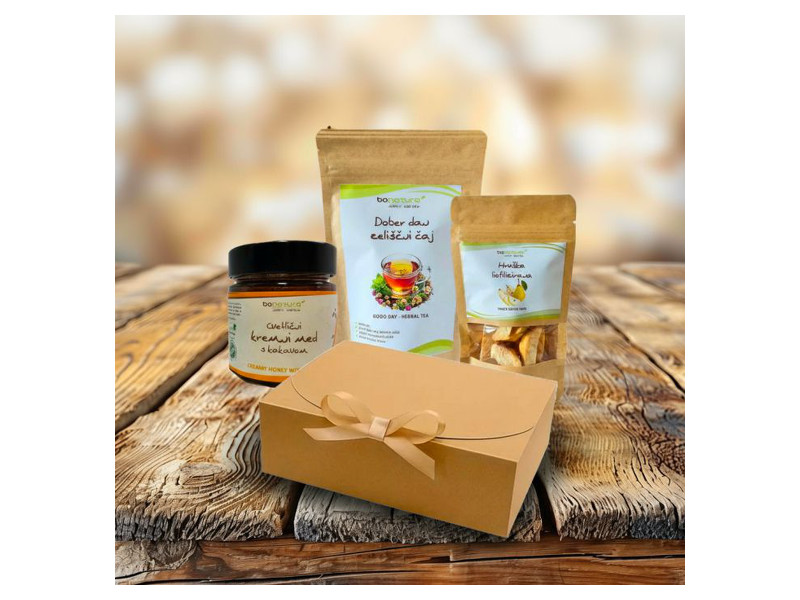 Naj vas večer popelje v sproščen objem in sladek počitek. Darilni paket združuje kremni med s surovim kakavom za nežno razvajanje, zeliščni čaj-lahko noč za pomiritev telesa in misli ter hrustljavo liofilizirano hruško za lahkotno, naravno crkljanje pred spanjem.