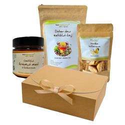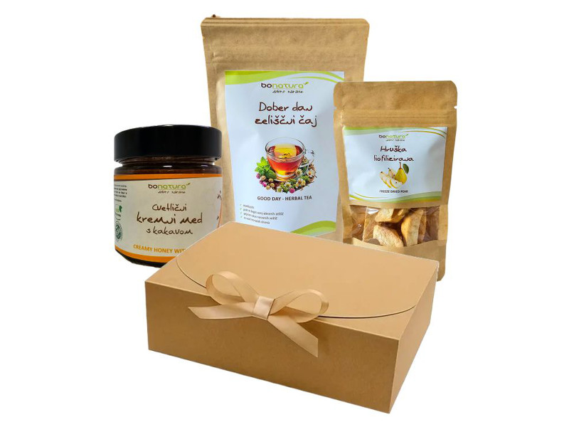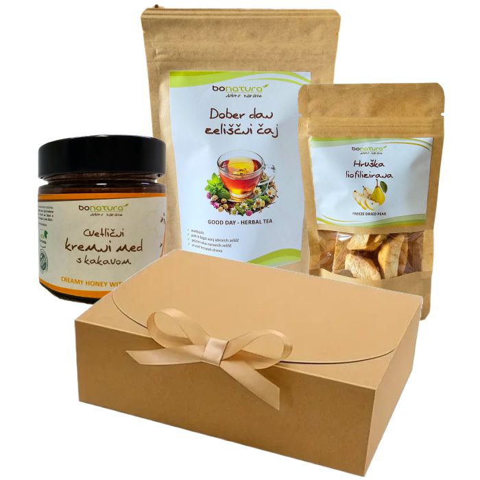 Darilni paket Razvajanje je ustvarjen za sladke pavze in male užitke. Kremni med s surovim kakavom za čokoladno razvado brez slabe vesti, zeliščni čaj-dober dan za nežno poživitev in hrustljave liofilizirane hruške viljamovke za naravno sladkost – vse, kar potrebujete za trenutke pravega razkošja.