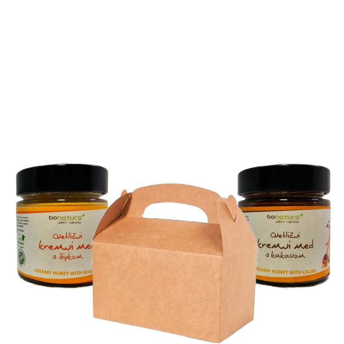 Darilni paket - medeni dotik združuje dve posebni medeni poslastici: med s surovim kakavom za čokoladno razvado brez slabe vesti, ter med s šipkom za dodatnimi vitamini. Popolna kombinacija naravne sladkosti in dobrobiti za telo in dušo.
