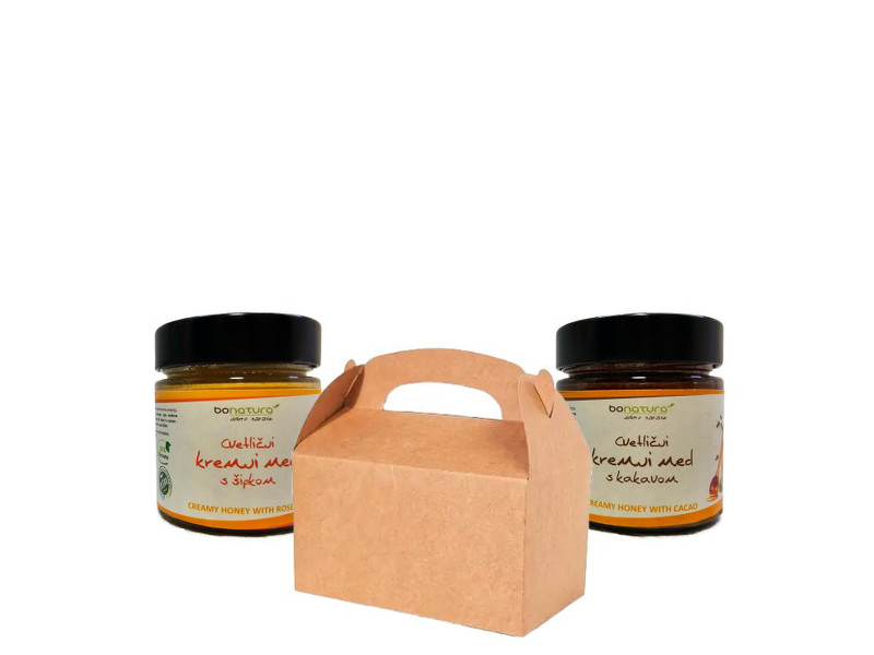 PAKIRANO: cvetlični kremni med z surovim kakavom neto količina 250 g, cvetlični kremni med s šipkom neto količina 250 g.