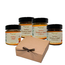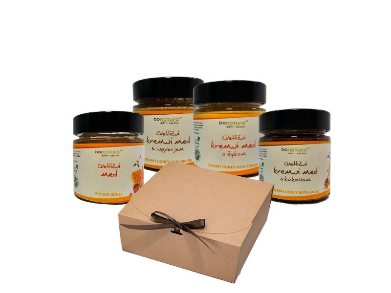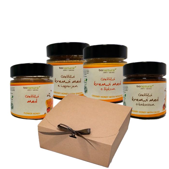 Razveselite sebe ali svoje najdražje z razkošjem medenih okusov. Darilni paket -medeni užitki združuje nežno sladkost cvetličnega medu, kremni med s šipkom za sadno noto, kremni med z ingverjem za toplino in poživitev ter kremni med s surovim kakavom za sladek čokoladni užitek. Popolna izbira za gurmanske trenutke in naravno razvajanje.
