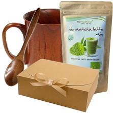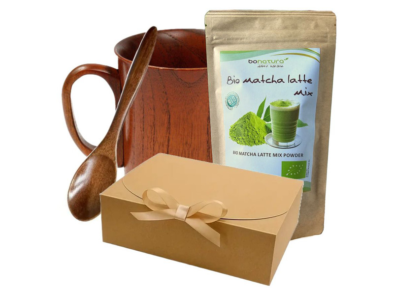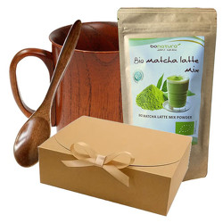 PAKIRANO: Lesni kozarec 250 ml z leseno žličko+ napitek za pripravo matcha latte 150 g v darilni embalaži.