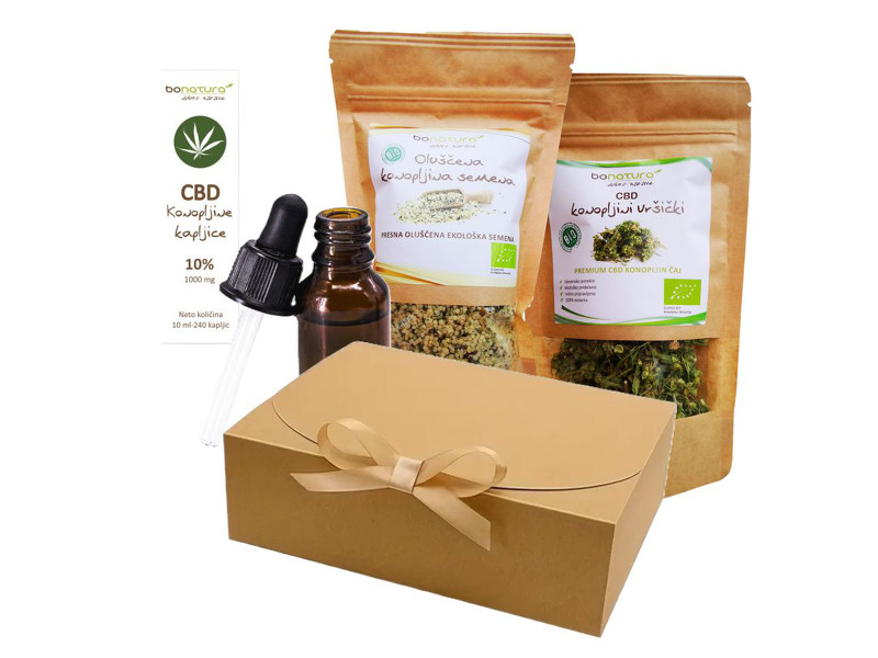 PAKIRANO: CBD kapljice 10% - 10ml , bio oluščena konopljina semena 250 g , konopljin čaj premium - CBD vršički 30 g.