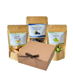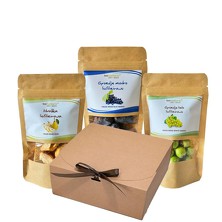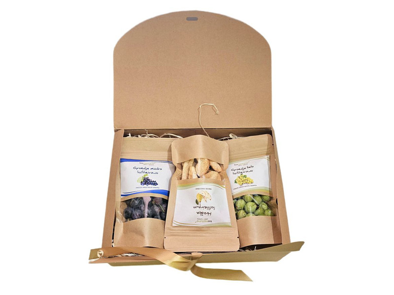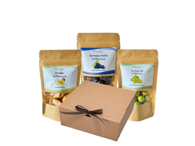 Darilni paket Sadni prigrizki združuje tri vrhunske liofilizirane okuse, ki navdušijo s svojo naravno svežino in popolno hrustljavostjo. Temno in belo grozdje prineseta sladko energijo, hruška Viljamovka pa poskrbi za nežno sadno aromo – skupaj ustvarjajo popoln trio za vse, ki obožujejo zdrave, naravne prigrizke.