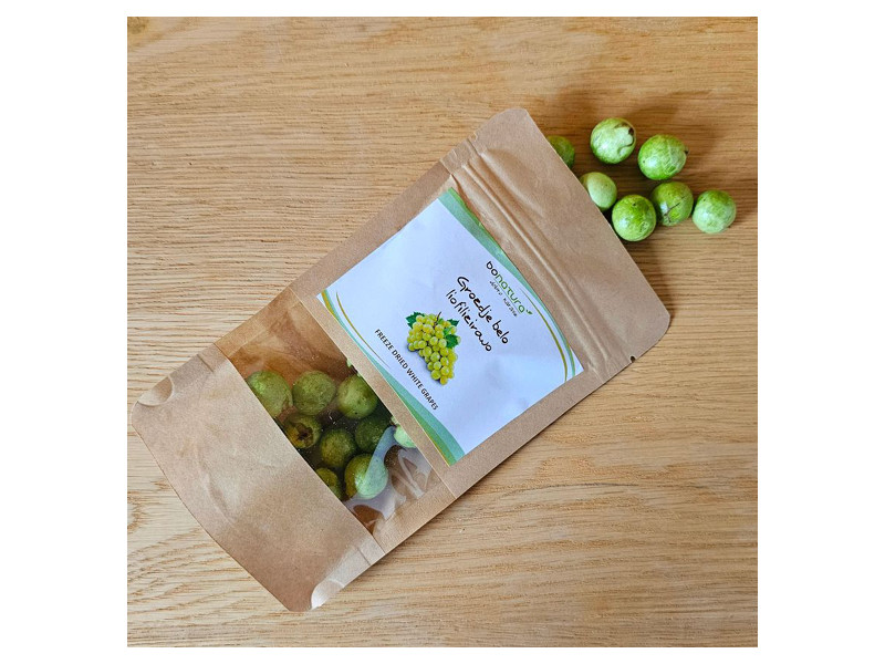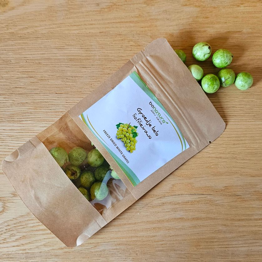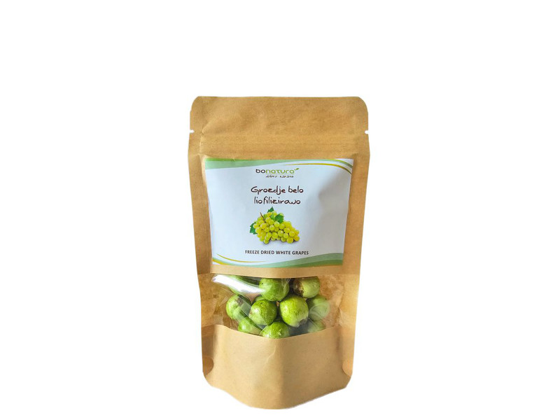 Liofilizacija je naraven postopek sušenja z zamrzovanjem, pri katerem se odstrani voda. Na ta način se skoraj v celoti ohranijo hranilne snovi, naravna barva, oblika, aroma, vitamini in minerali. Liofilizacija odstrani vodo, zato so kalorije, sladkorji, vlaknine in minerali koncentrirani. Iz 100 g svežega grozdja dobimo približno 10 g liofiliziranega– zato je prigrizek hranljiv in intenziven v okusu.