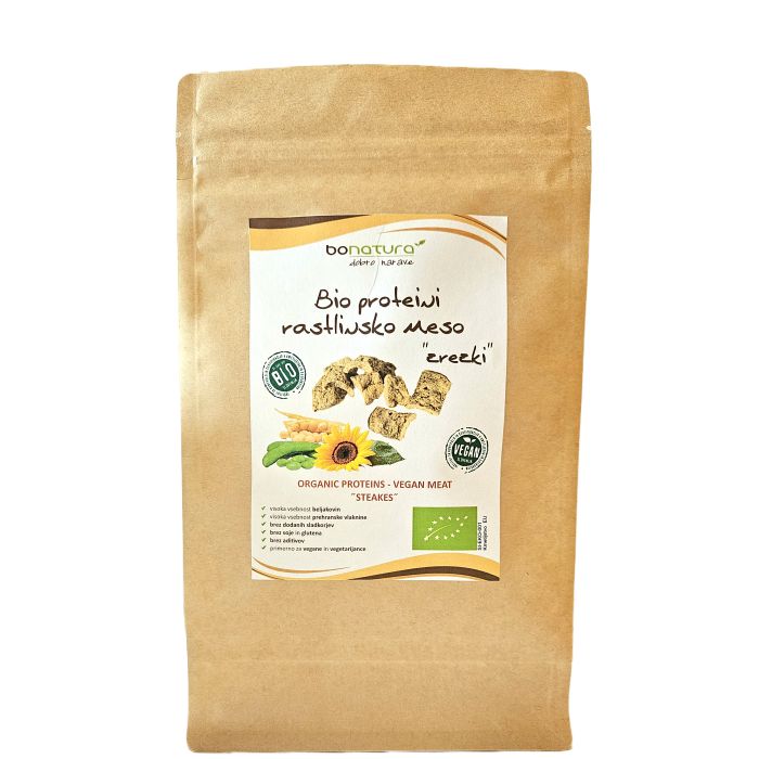 AngleškiRastlinski proteini – hranljiv, 100 % ekološki nadomestek mesa, ki je kot nalašč za zrezke, nabodala, solate, jedi iz voka ter pečene ali popečene jedi.