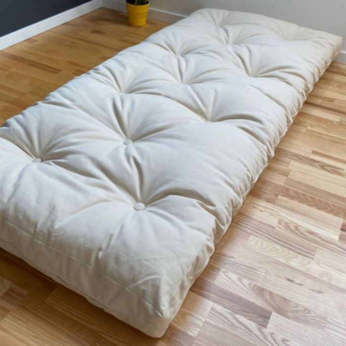 Futon ležišče je tudi dobra izbira za ljudi, ki iščejo 100% naravno alternativo tradicionalnim vzmetnicam iz umetne mase – v kombinaciji z visokokakovostno estetiko šivanja, materiala in prešitja – futon je prešit ročno z gumbi za oblazinjenje – kar mu daje edinstven končni učinek.