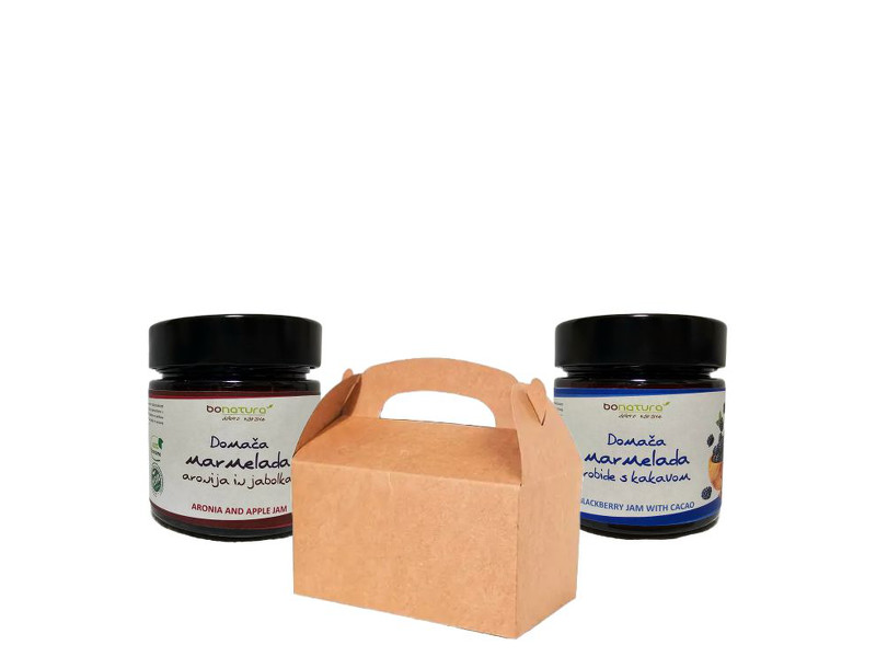 PAKIRANO: domača marmelada aronija in jabolka neto količina 250 g, domača marmelada robida z surovim kakavom 250 g.