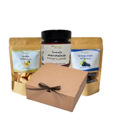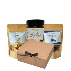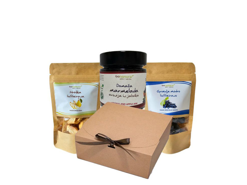 PAKIRANO: hruška liofilizirana neto količina 25 g, grozdje liofilizirana neto količina 25 g, mango sušene rezine 100g, domača marmelada aronija in jabolka neto količina 250 g.