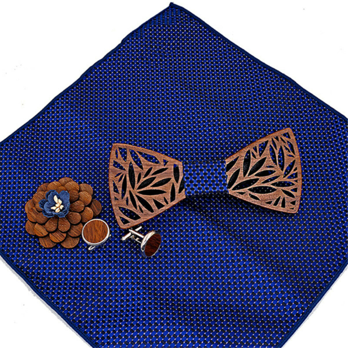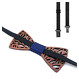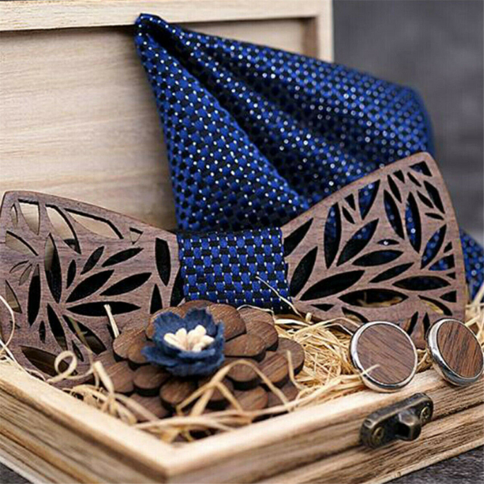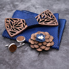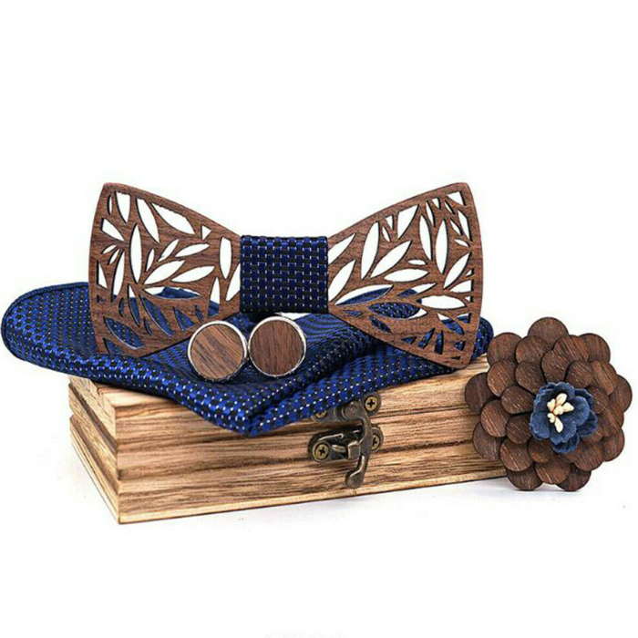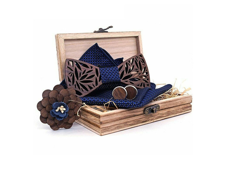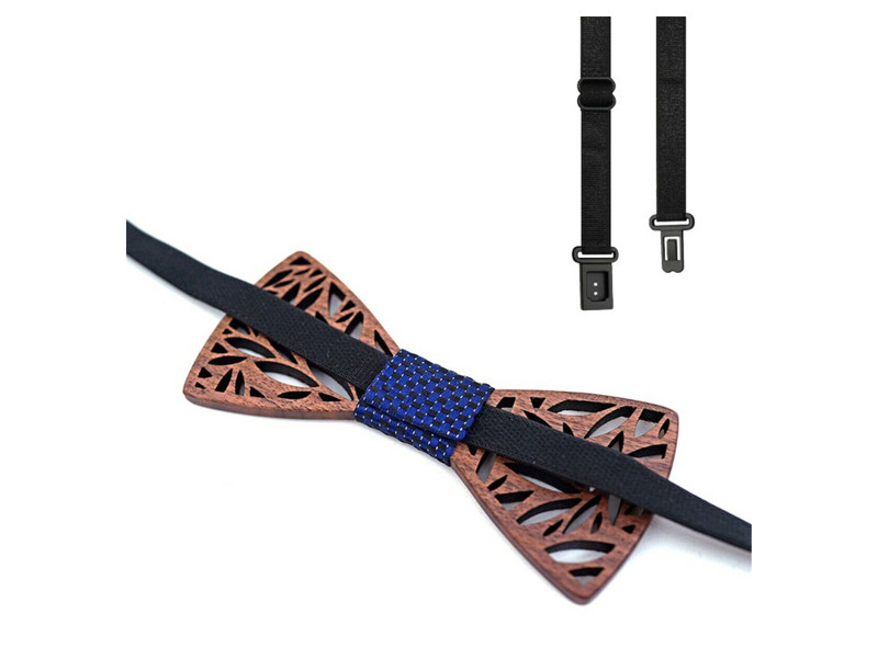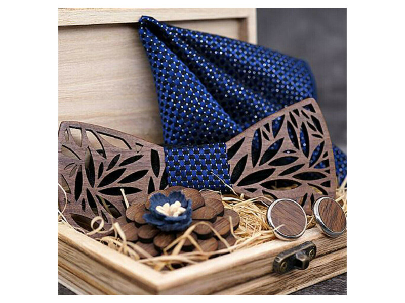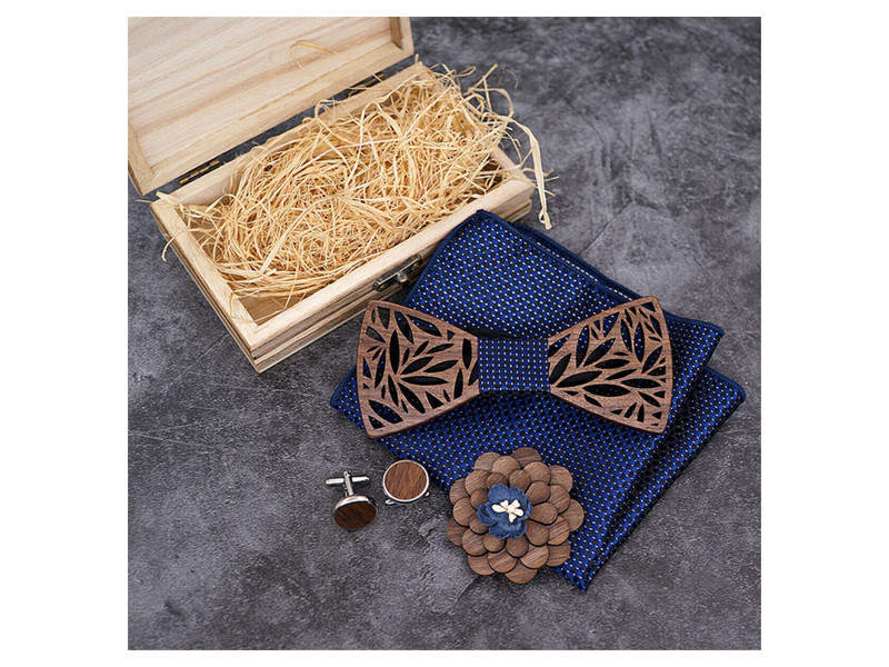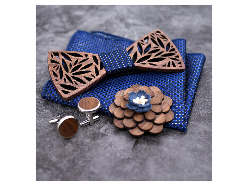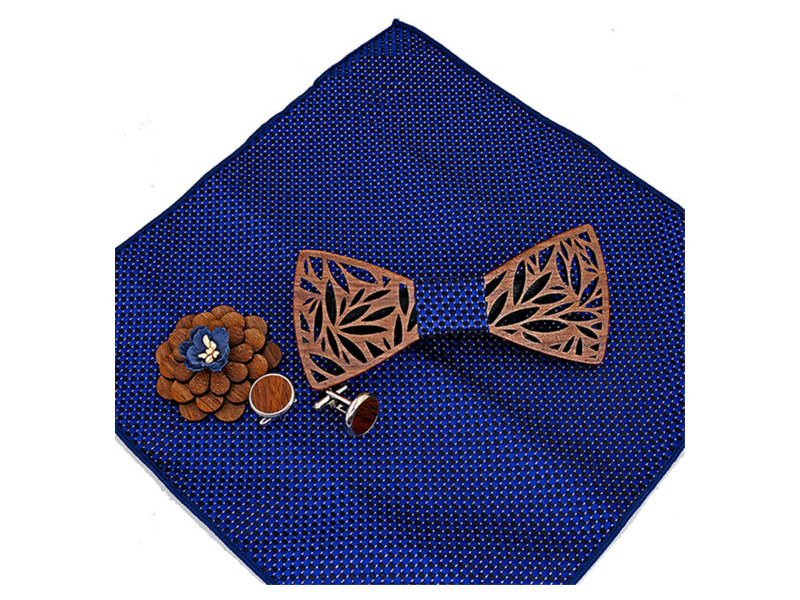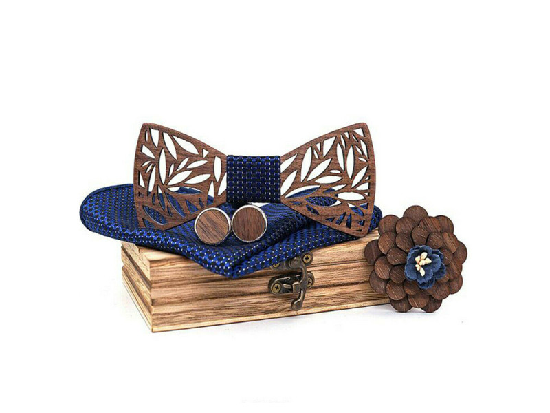 Lesen metuljček je narejen iz 90% naravnega materiala (lesa) in vzorčnega tekstila ki je kot osrednja točka. Opremljen je s trakom in zaponko, ki se lahko regulira glede na velikosti in širino ovratnika. V kompletu je dodan robček, ki služi kot modni dodatek v prsnem žepu.