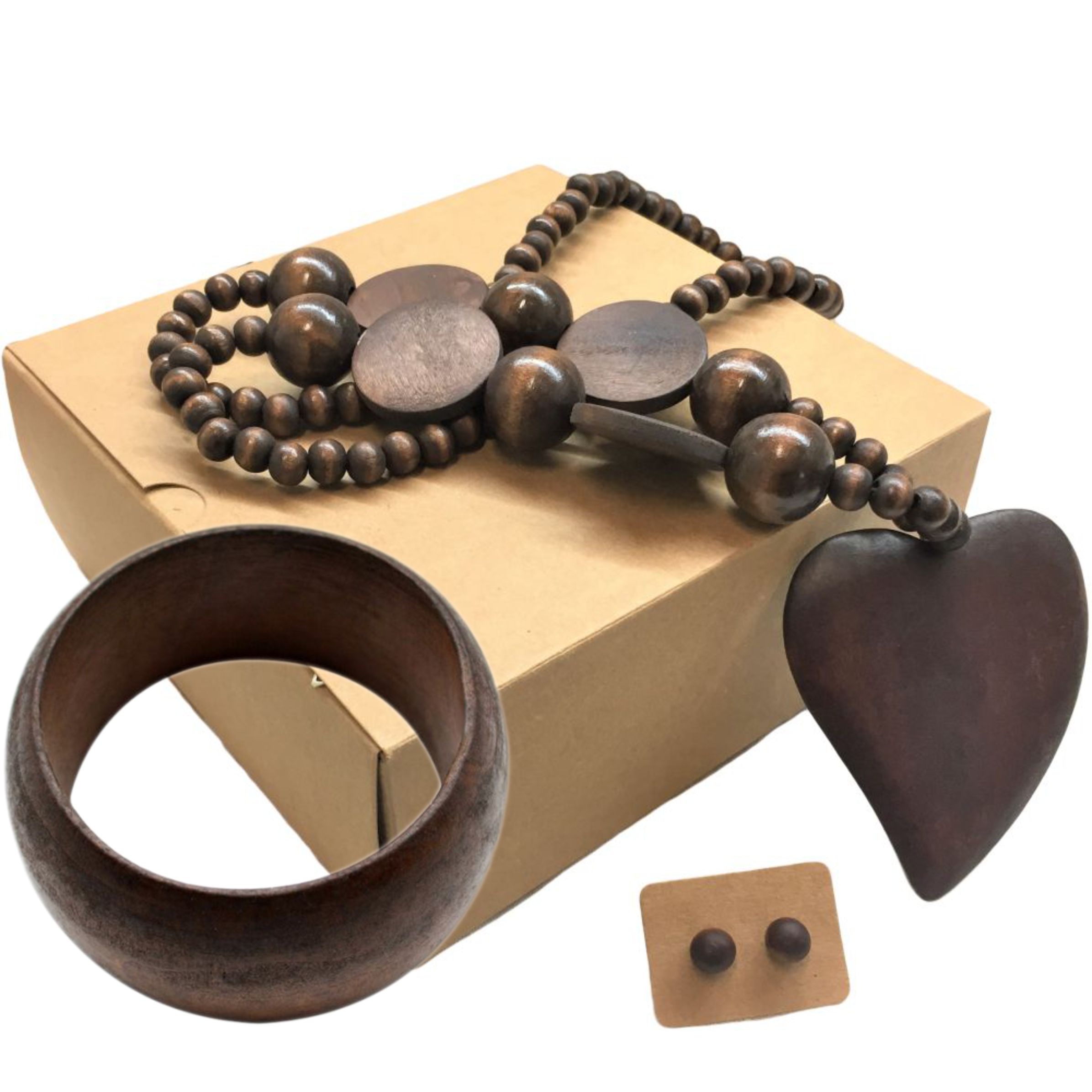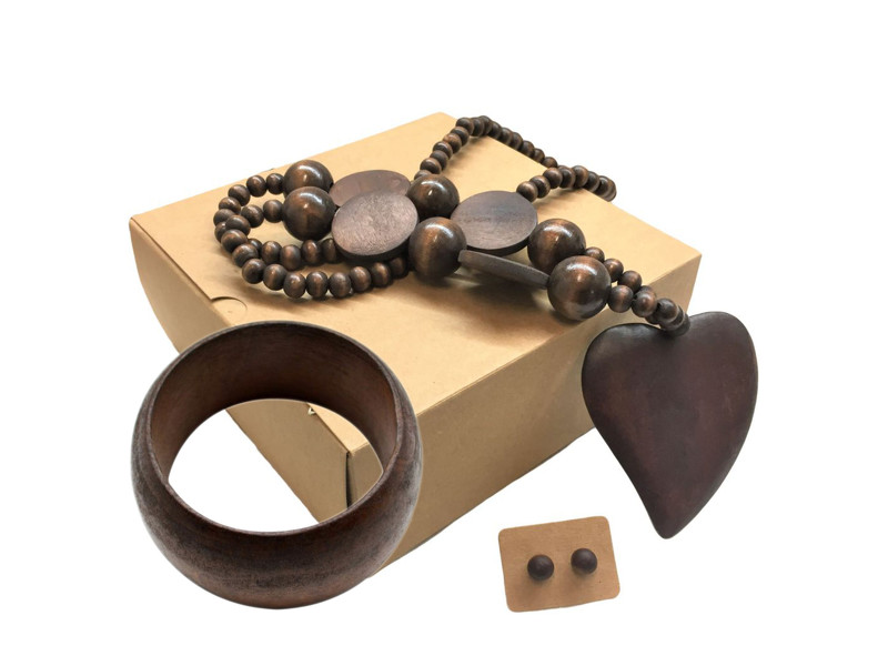PAKIRANO: lesena ogrlica "srce S", lesena uhana-par "bunka", zapestnica "RT"