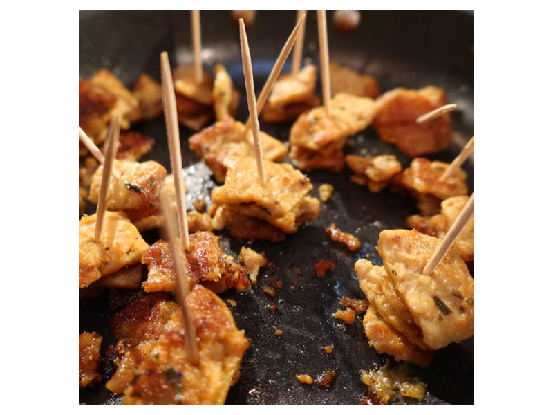 AngleškiRastlinski proteini – hranljiv, 100 % ekološki nadomestek mesa, ki je kot nalašč za zrezke, nabodala, solate, jedi iz voka ter pečene ali popečene jedi.